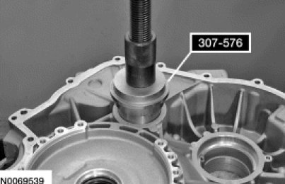 48. Using the Bearing Cup Installer 307-576, Transfer Gear Bearing Installer 307-541 and the Drawbar 204-029, press the differential bearing cup in the torque converter housing.