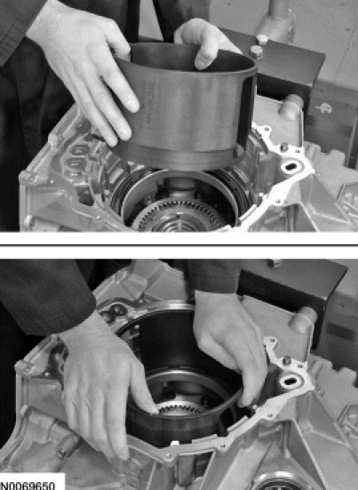 63. NOTE: Install the 2-6 Spring Compressor 307-584/1 with the stepped end of the cylinder facing downward when pushing the forward clutch piston into the bore.