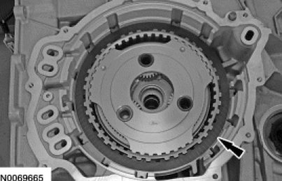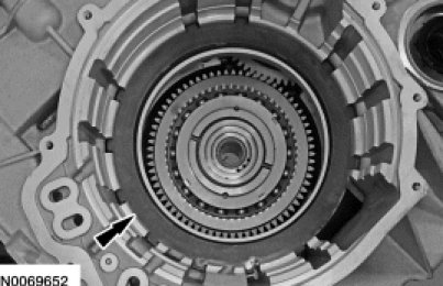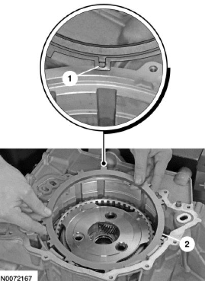 73. Compare the position of the low OWC snap ring gap with the tab on the low/reverse clutch pressure plate to be sure that the gap is in the right position.