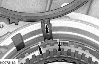 88. NOTICE: Failure to align the tab on the bottom of the low/reverse pressure plate with the gap in the low One-Way Clutch (OWC) snap ring may result in damage to the transaxle.