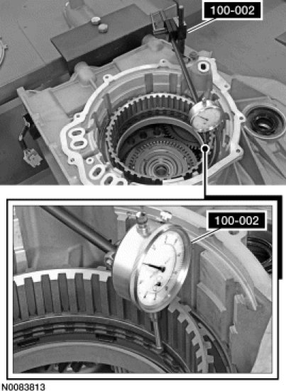 74. Install the Dial Indicator Gauge with Holding Fixture 100-002 on the transaxle case and position the plunger on a top friction disc tab.