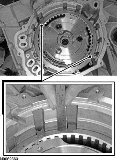 89. Measure the depth of the low/reverse clutch pressure plate where the tab fits into the gap of the low OWC snap ring and directly across from it. If the pressure plate is seated correctly, the depth should be the same. If the depths are different, rotate the snap ring so that the gap fits around the tab on the pressure plate.