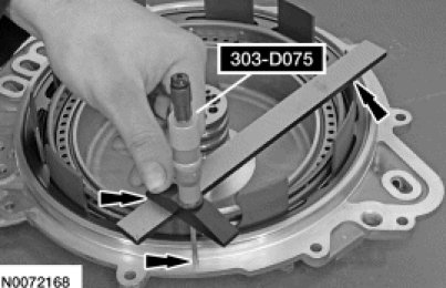 100 Using a suitable straightedge and the Depth Micrometer 303-D075, measure and record as measurement A, the distance from the transaxle case deck surface to a low point on the intermediate clutch wave spring.