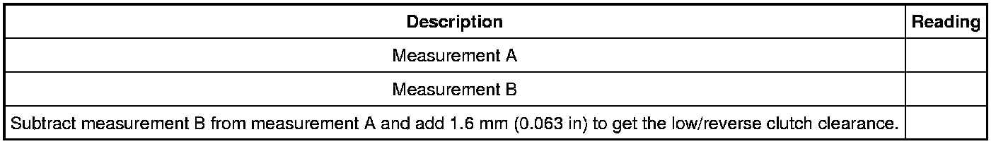95. Subtract measurement B from measurement A and add 1.6 mm (0.063 in), to compensate for the thickness of the gasket, to get the low/reverse clutch clearance. The clearance should be between 1.01 mm (0.040 in) and 2.47 mm (0.1 in). If the clearance is out of range, check the low/reverse clutch pack for correct installation. If the low/reverse clutch pack is correctly installed, install a new low/reverse clutch pack.