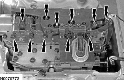 11. Remove the 10 main control valve body bolts and the valve body.