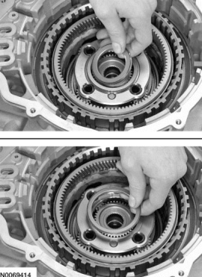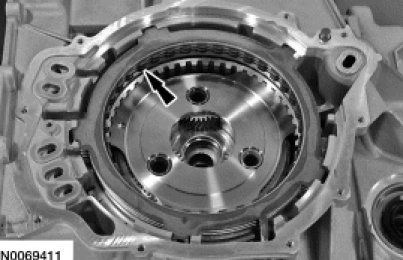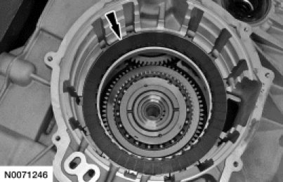 25. NOTE: The location of the tab on the bottom pressure plate is aligned with the gap for the low One-Way Clutch (OWC) snap ring.