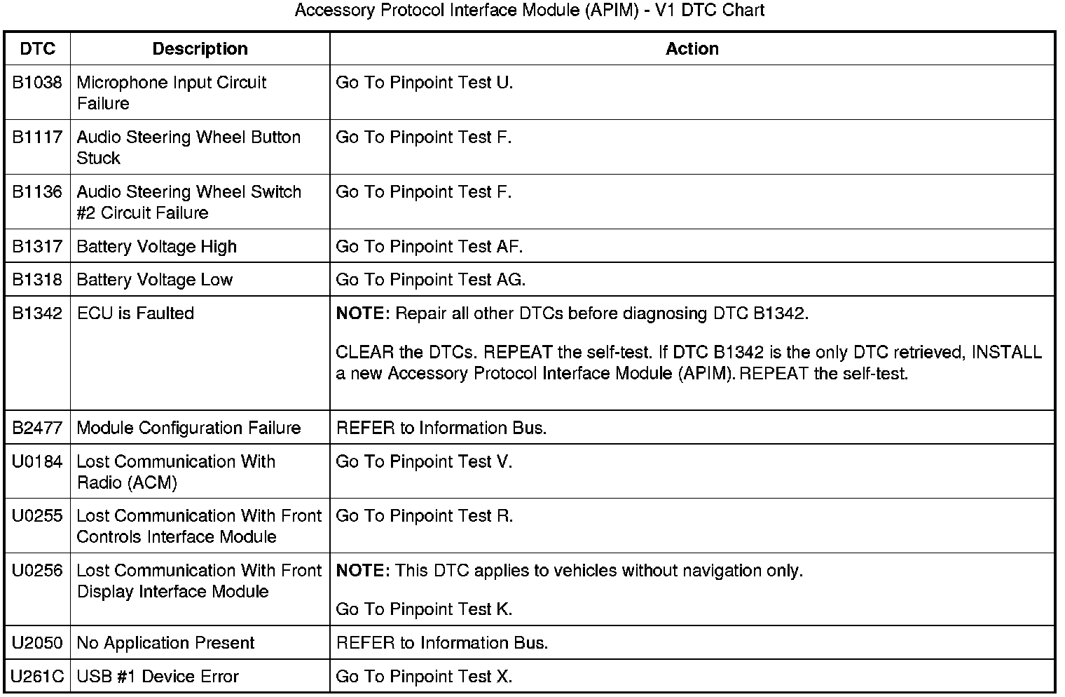 Accessory Protocol Interface Module (APIM) - V1 DTC Chart