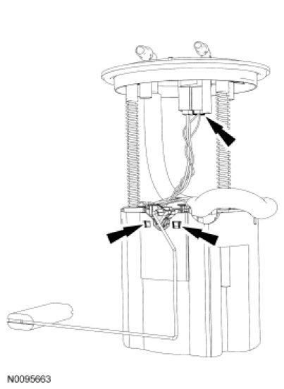 2. Disconnect the electrical connector, release the locking tabs and remove the fuel level sender from the FP module.