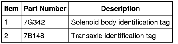 Any time a new solenoid body is installed, a new solenoid body strategy file is downloaded into the PCM using the scan tool. A replacement solenoid body tag is supplied with the new solenoid body which contains the 13-digit solenoid body strategy and the 7-digit solenoid body identification. The new tag is placed over the original solenoid body tag.