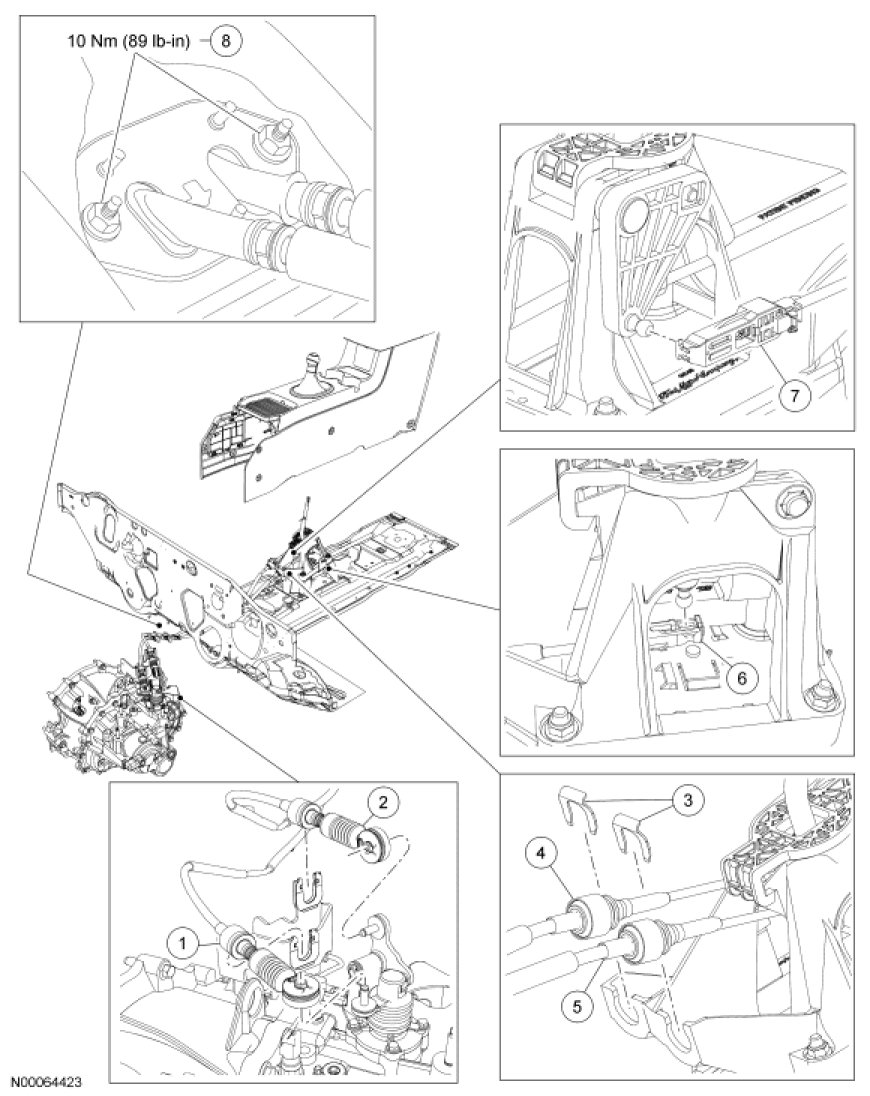 6. Disconnect the gearshift cables from the gearshift lever assembly.