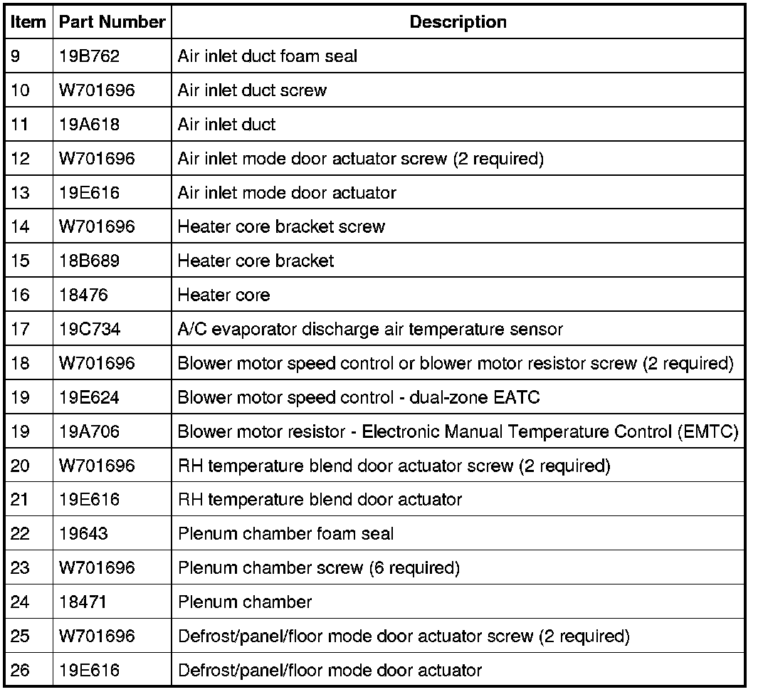 17. Remove the heater core and evaporator core housing drain dash panel seal.