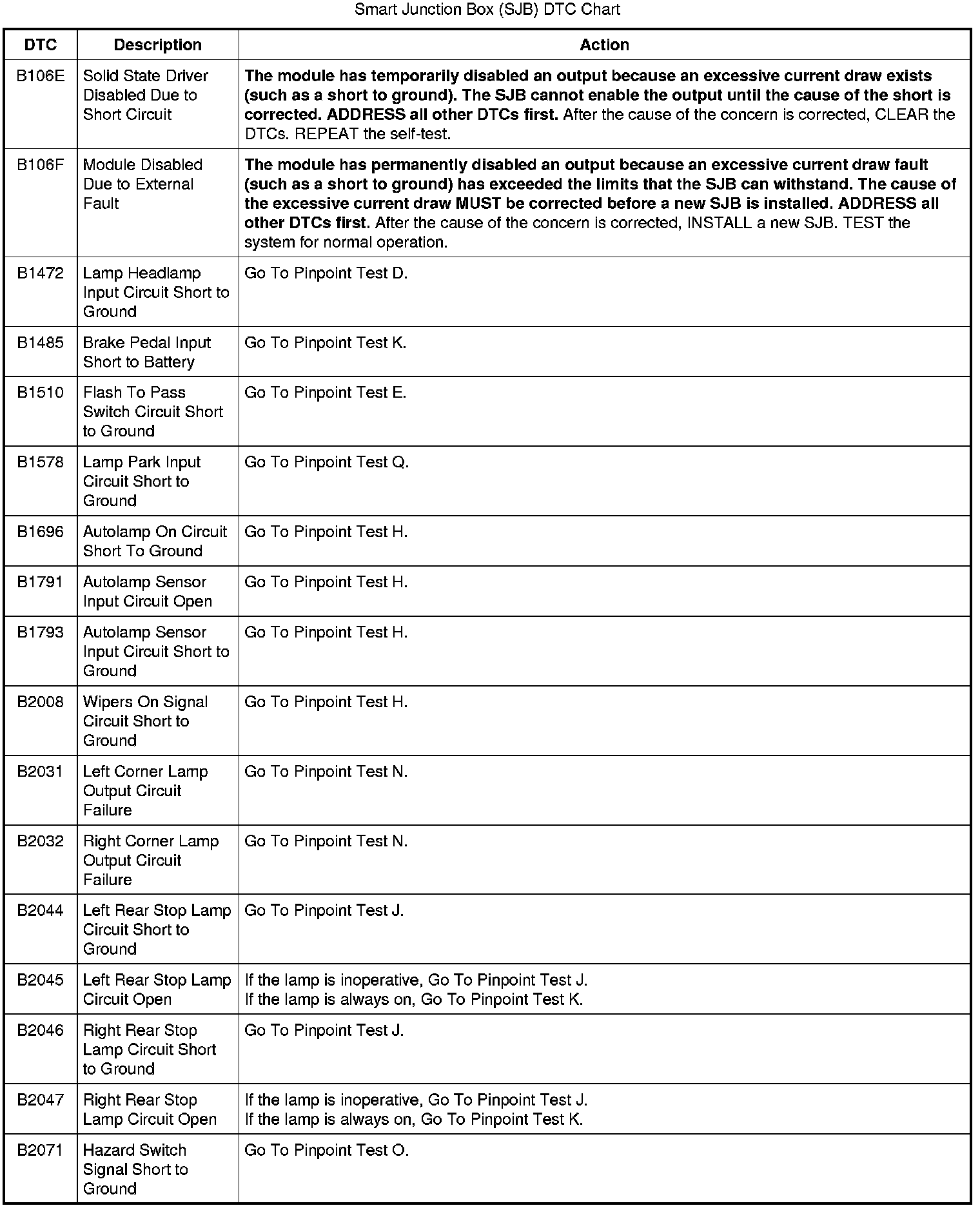 Smart Junction Box (SJB) DTC Chart