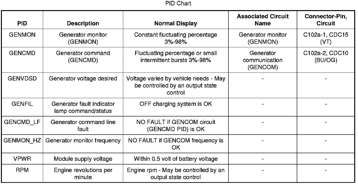 This system uses 2 communication lines between the PCM and the generator/voltage regulator. Both of these communication lines use Pulse-Width Modulation (PWM). The generator communication (GENCOM) line communicates the desired set point from the PCM to the voltage regulator. The generator monitor (GENMON) line communicates the generator load and error conditions to the PCM. The GENCOM command is only sent by the PCM when it is necessary to adjust the voltage set point. If the set point does not need to be changed, several seconds may elapse between PCM GENCOM commands. This normal operation will appear in the PID as occasional "bursts" of pulse-width commands. The third pin on the voltage regulator, the A circuit pin, is a circuit dedicated to monitor or sense battery voltage.
