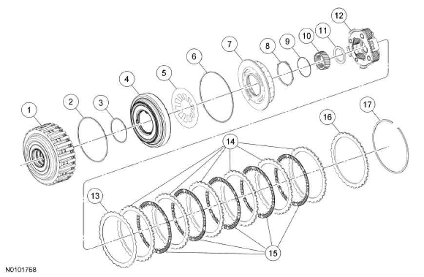 15. Clean and inspect the components of the forward clutch assembly for damage and install new components as necessary.