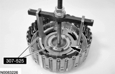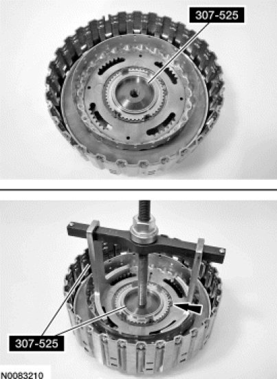 6. NOTE: The bottom of the Clutch Spring Compressor 307-525 will need to be installed from the back side of the forward clutch assembly.