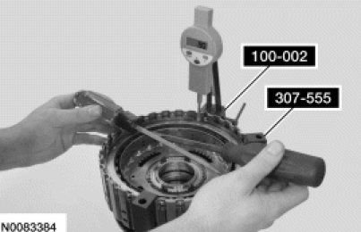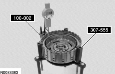 Install the forward clutch assembly into the Clutch End Play Gauge 307-555 and install the Dial Indicator Gauge with Holding Fixture 100-002 and position the plunger so it fits into the opening of the snap ring.