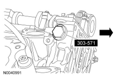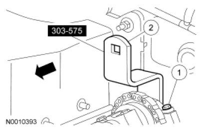 18. Install the Camshaft Sprocket Holding Tool and the Adapter for 303-564 on the front of the LH cylinder head and tighten the top 2 clamp bolts to 10 Nm (89 lb-in).