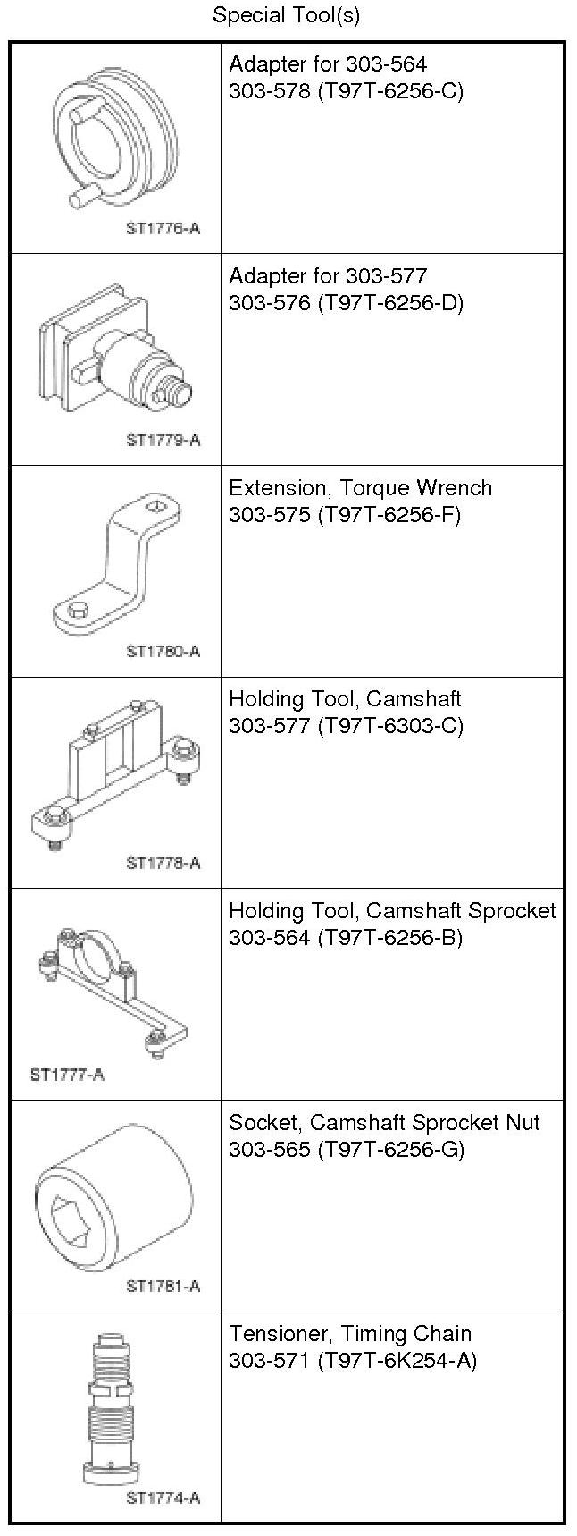 17. Remove the Camshaft Holding Tool, the Adapter for 303-577, the Camshaft Sprocket Holding Tool and the Adapter for 303-564 from the RH cylinder head.