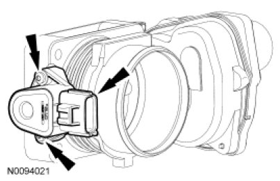 1. Using a suitable heat gun, apply heat to the top of the Electronic Throttle Body (ETB) until the top TP sensor bolt ear reaches approximately 55°C (130°F), this should take no more than 3 minutes using a 1100-watt heat gun. The heat gun should be about an 25.4 mm (1 in) away from the ETB.