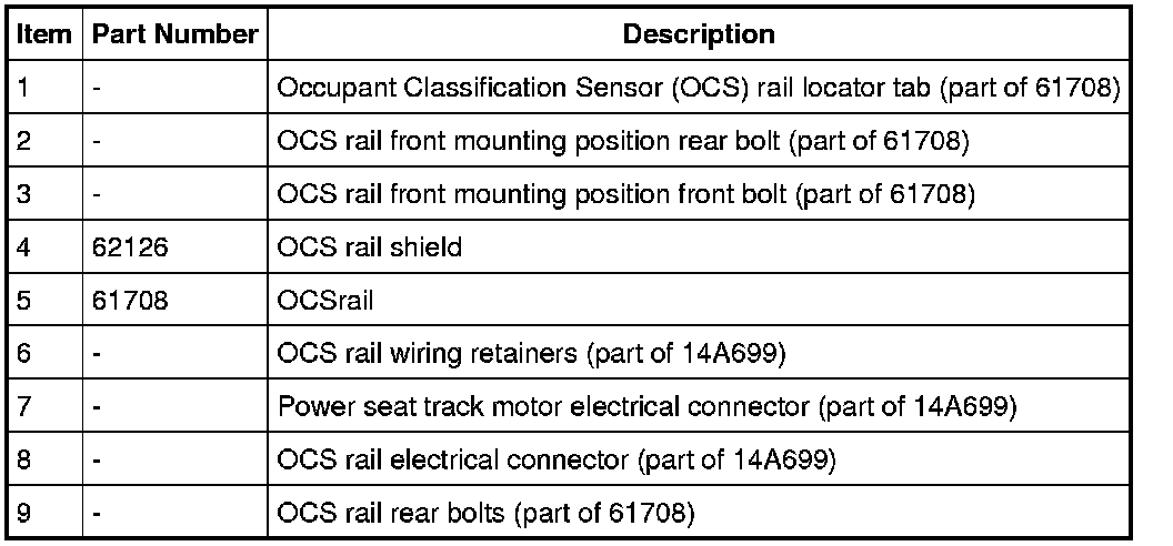 NOTICE: Prevent oil and/or grease from getting on the Occupant Classification Sensor (OCS) rail bolts as this can lead to tightening beyond the specified torque value. Failure to follow this instruction may result in damaged or broken OCS rail bolts.