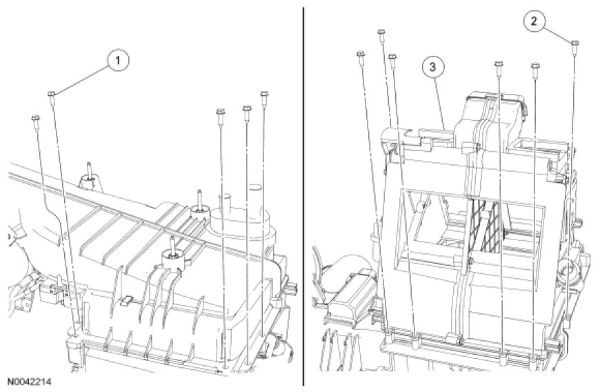 - Tighten the evaporator core cover screws in a diagonal pattern to distribute the RTV sealant evenly.