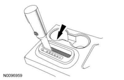 3. Using a suitable tool, press the brake shift interlock override mechanism on the selector lever assembly, apply the brake pedal, press the button on the selector lever knob and move the selector lever into NEUTRAL.