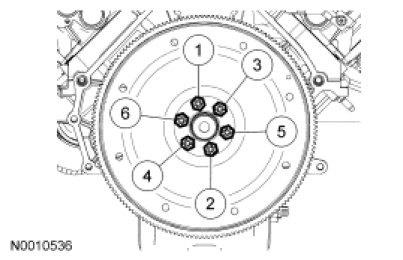 Position the flexplate and install the 6 bolts in the sequence shown.