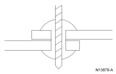 1. Line drill a hole the size of the bolt through the old rivet hole. Example: for an 11.11 mm (7/16 in) diameter rivet, use a 12.7 mm (1/2 in) drill bit.