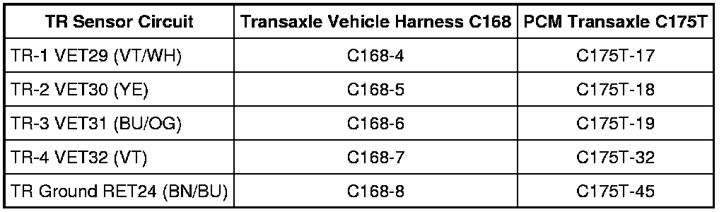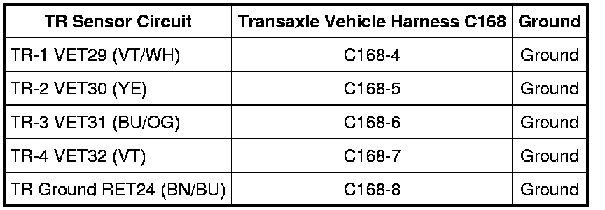 NOTE: Refer to the Transmission Range (TR) Sensor Connector illustration Transaxle Connector Layouts Symptom Related Diagnostic Procedures.