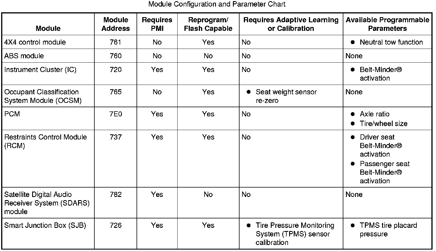 PMI is a scan tool process which configures settings in a new module. Data used for the PMI process is automatically downloaded from the original module and stored when a scan tool session is started. If this data cannot be retrieved from the module being replaced, the scan tool may prompt for As-Built data entry or display a list of parameter values that need to be manually selected. Some modules are reprogrammed during PMI when a strategy/calibration update is available. To carry out PMI, refer to Programmable Module Installation (PMI) Programming and Relearning.