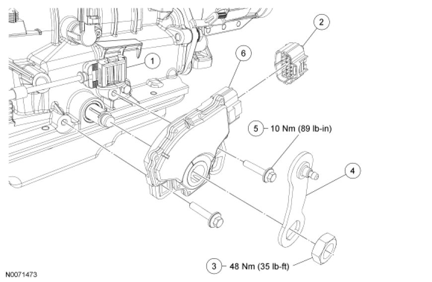 2. NOTICE: Tightening one screw before tightening the other may cause the Transmission Range (TR) sensor to bind or become damaged.