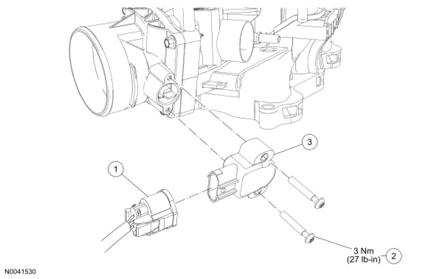 4. NOTICE: Do not use a high-speed driver to install the new screws or the Throttle Position (TP) sensor may be damaged.