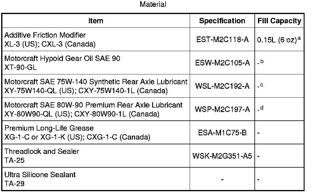 a For a complete refill on Model 60 axles equipped with a limited slip differential, add 0.15L (6 oz) of Additive Friction Modifier XL3 meeting Ford specification EST-M2C118-A to lubricant. Model 70 axles equipped with a limited-slip differential have carbon-fiber clutch discs that do not require any friction modifier.