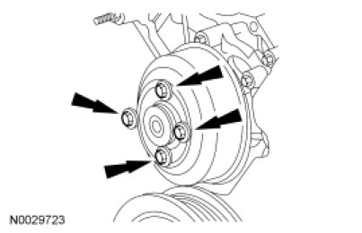 19. Position the coolant pump pulley on the coolant pump and install the 4 bolts finger-tight.