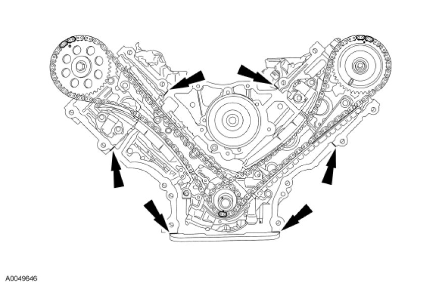 Apply a bead of silicone gasket and sealant along the cylinder head-to-cylinder block surface and the oil pan-to-cylinder block surface, at the locations shown.