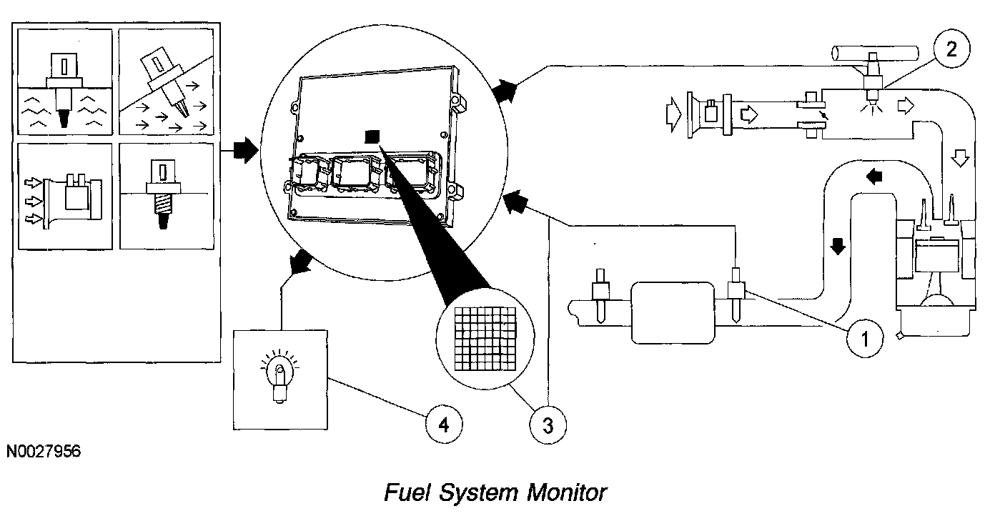 FUEL SYSTEM MONITORThe fuel system monitor is an on-board strategy designed to monitor the fuel control system. The fuel control system uses fuel trim tables stored in the powertrain control module (PCM) keep alive memory (KAM) to compensate for the variability that occurs in fuel system components due to normal wear and aging. FUl31 trim tables are based on air mass. During closed-loop fuel control, the fuel trim strategy learns the corrections needed to correct a biased rich or lean fuel system. The correction is stored in the fuel trim tables. The fuel trim has 2 means of adapting: long term fuel trim and a short term fuel trim. Refer to Powertrain Control Software, Fuel Trim. Long term fuel trim relies on the fuel trim tables and short term fuel trim refers to the desired air/fuel ratio parameter called LAMBSE. LAMBSE is calculated by the PCM from the heated oxygen sensor (HO2S) inputs and helps maintain a 14.7:1 air/fuel ratio during closed-loop operation. Short term fuel trim and long term fuel trim work together. If the HO2S indicates the engine is running rich, the PCM corrects the rich condition by moving the short term fuel trim into the negative range, less fuel to correct for a rich combustion. If after a certain amount of time the short term fuel trim is still compensating for a rich condition, the PCM learns this and moves the long term fuel trim into the negative range to compensate and allow the short term fuel trim to return to a value near 0%. Inputs from the engine coolant temperature (ECT) or cylinder head temperature (CHT), intake air temperature (IAT), and mass air flow (MAF) sensors are required to activate the fuel trim system, which in turn activates the fuel system monitor. Once activated, the fuel system monitor looks for the fuel trim tables to reach the adaptive clip (adaptive limit) and LAMBSE to exceed a calibrated limit. The fuel system monitor stores the appropriate DTC when a concern is detected as described below. Powertrain Control Software