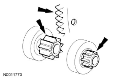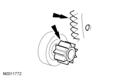 1. Check the wear patterns on the starter drive and the flexplate ring gear. If the wear pattern is not normal, install a new starter motor. For additional information, refer to Starter Motor Service and Repair.