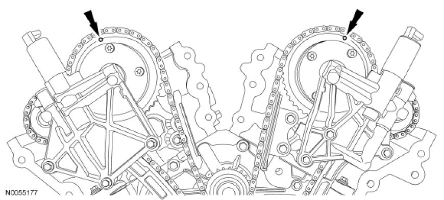 14. Install the primary timing chain with the colored links aligned with the timing marks on the VCT assemblies and the crankshaft sprocket.