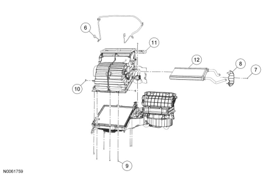 11. NOTICE: Do not handle the heater core by the inlet and/or outlet tube to remove. Handling the heater core by the tubes may damage the joints and lead to failure of the heater core.