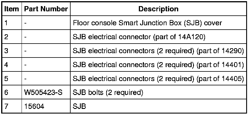 NOTE: Prior to the replacement of the module, it is necessary to upload the module configuration information to a scan tool. This information must be downloaded into the new Smart Junction Box (SJB) after installation. For additional information, refer to Information Bus. In the event that As-Built data is required (SJB does not communicate), all Remote Keyless Entry (RKE) devices must be programmed to the new SJB. A minimum of 2 RKE devices are necessary to complete the configuration and turn off the flashing interior lights. The Tire Pressure Monitoring System (TPMS) functionality is integral to the SJB.