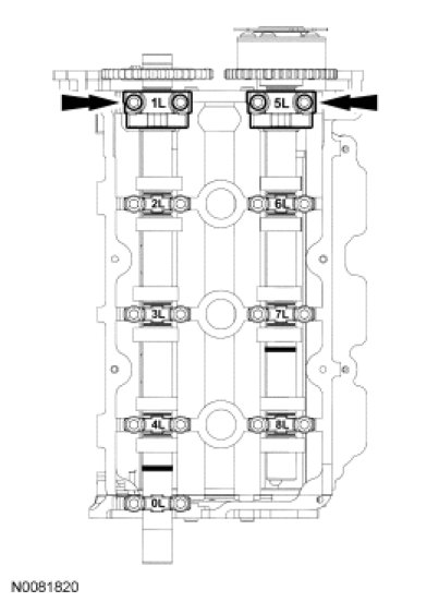 - Align the LH camshafts as shown.