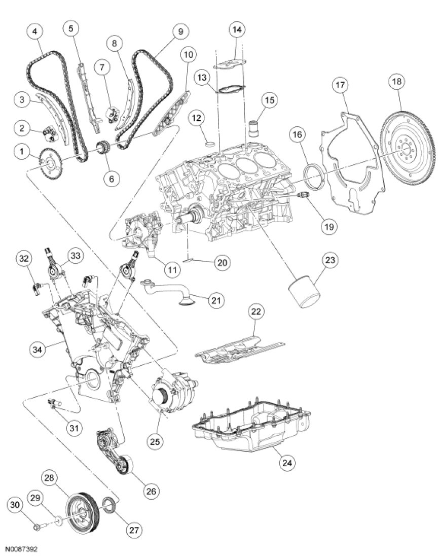 NOTICE: During engine repair procedures, cleanliness is extremely important. All parts must be thoroughly cleaned and any foreign material, including any material created while cleaning gasket surfaces, that enters the oil passages, coolant passages or the oil pan, can cause engine failure.