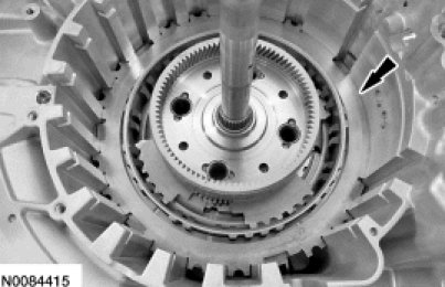 32. Using a suitable depth gauge, measure and record as measurement A, the distance from the Shim Selection Gauge 307-300 to the top of the intermediate (2, 6) clutch pack at 3 different points and average the 3 distances.