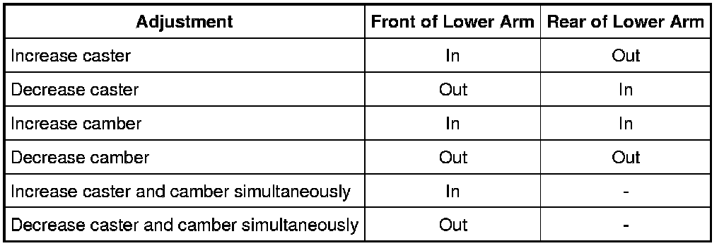 - Adjustments that require moving the front and the rear of the lower arm should be made equally.