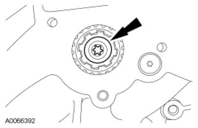 84. NOTE: It may be necessary to hold the oil pump intermediate shaft, using an E-12 external Torx socket, in order to remove the bolt if the bolt does not turn out easily at this time.