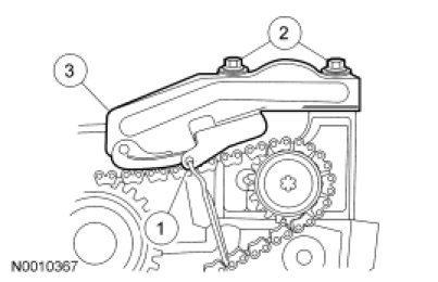 52. NOTICE: The RH camshaft sprocket bolt is a LH-threaded bolt. Turning the bolt in the wrong direction can damage the bolt.