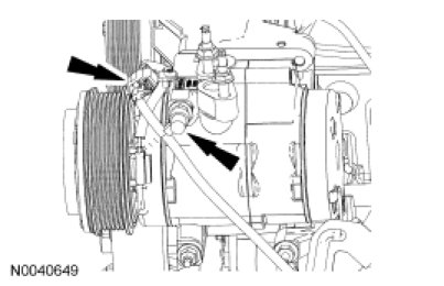 6. Disconnect the A/C compressor electrical connector and wire harness retainer.