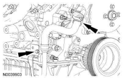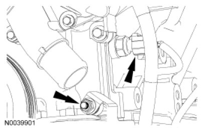 18. Remove the oil cooler hose bracket bolt, if equipped. Disconnect the oil cooler or heater hose.