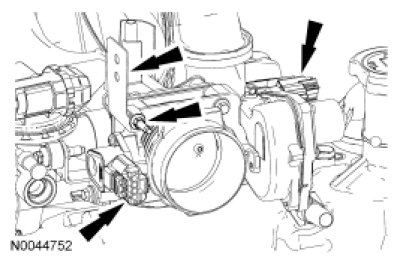 23. Disconnect the Electronic Throttle Body (ETB) and Throttle Position (TP) sensor electrical connectors. Remove the nut and detach the wiring harness bracket.