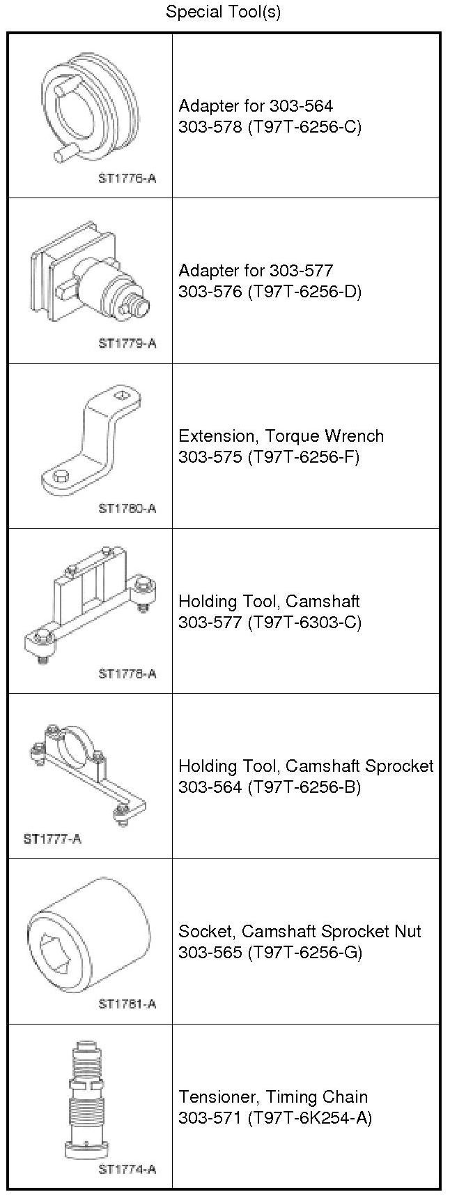 17. Remove the Camshaft Holding Tool, the Adapter for 303-577, the Camshaft Sprocket Holding Tool and the Adapter for 303-564 from the RH cylinder head.
